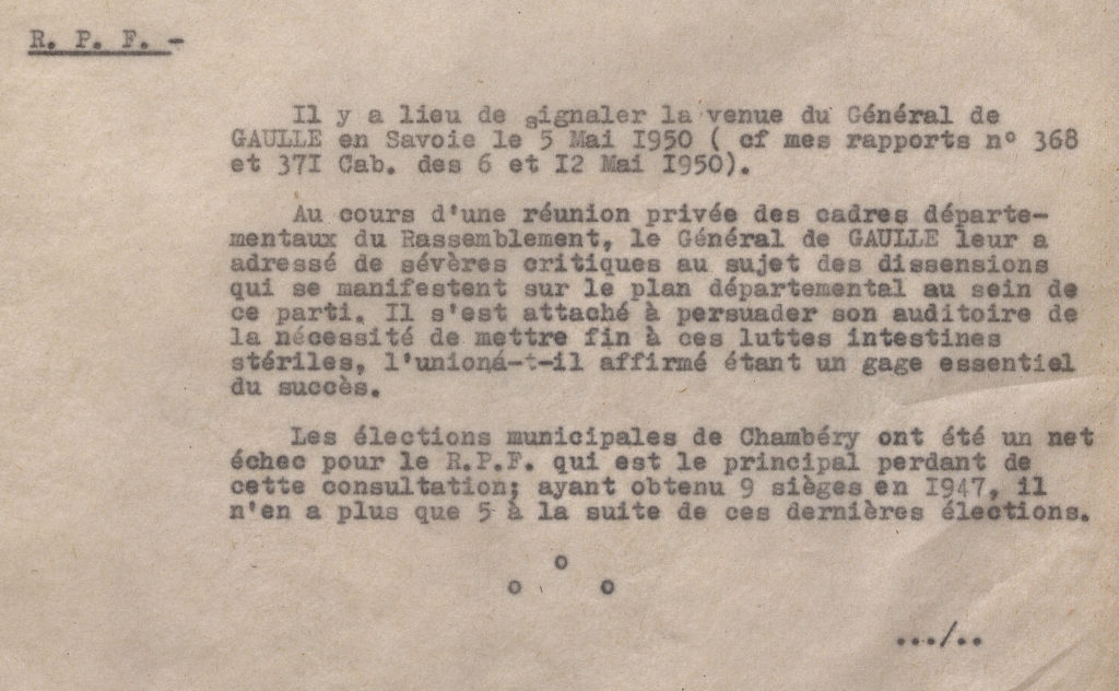 Voyage du général de Gaulle en Savoie : rapport du préfet relatant sa participation à la réunion des cadres départementaux du Rassemblement du Peuple Français, 31 mai 1950.