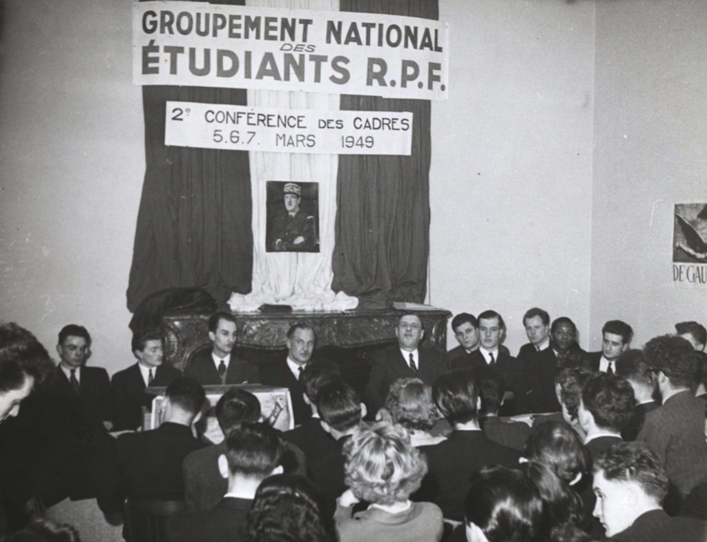 Groupement national des étudiants RPF, 2ème conférence des cadres en présence du général de Gaulle : photographie des participants parmi lesquels figurent Pierre Dumas (3ème à partir de la gauche) et Pierre de Gaulle, frère de Charles (4ème à partir de la gauche), mars 1949.