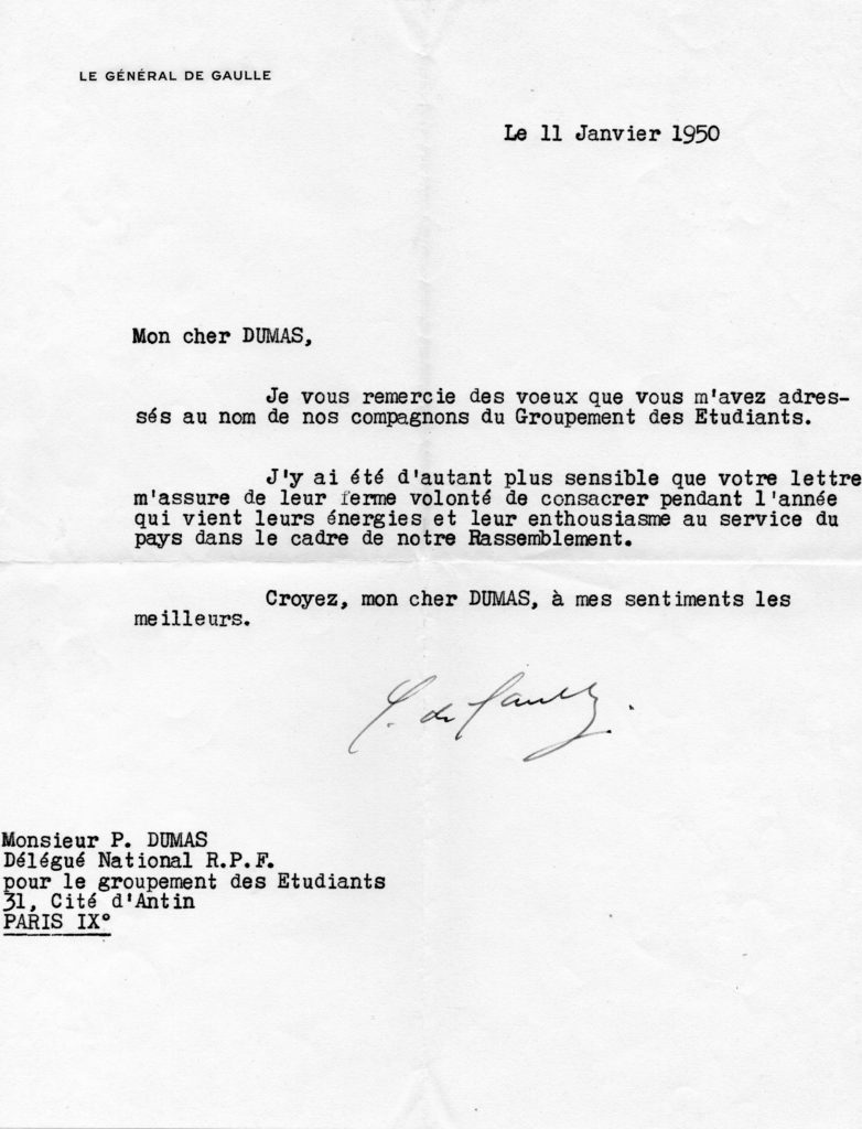 Groupement national des étudiants RPF : lettre du général de Gaulle à Pierre Dumas pour le remercier de ses vœux au nom du groupement, 11 janvier 1950.