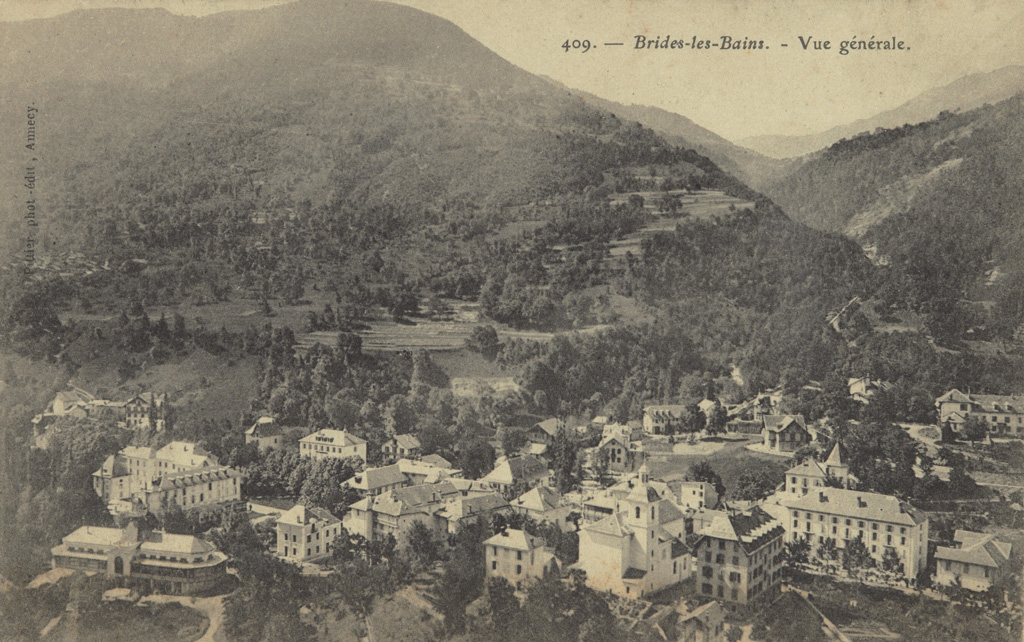 Vue générale de Brides-les-Bains dans la première moitié du XXe siècle. Cliché Pittier, éditions Pittier à Annecy.