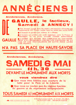 Affiche d’opposition à la visite du général de Gaulle invitant à une manifestation le 6 mai au monument aux morts d'Annecy, mai 1950.