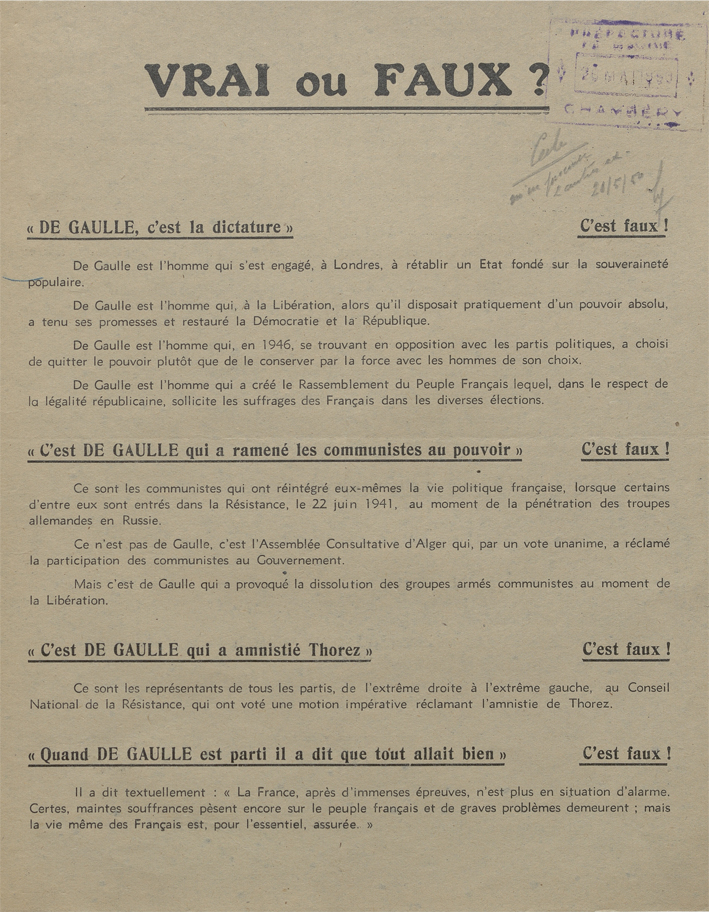 Élections municipales de Chambéry, scrutin du 21 mai 1950 : tract du RPF.