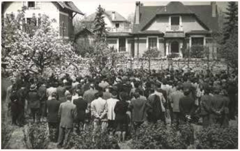 Le général de Gaulle dans le jardin de la villa La Sapinière, propriété de Marcel Fournier, avenue d’Albigny à Annecy, avec la foule des membres du Rassemblement du Peuple Français, 6 mai 1950.